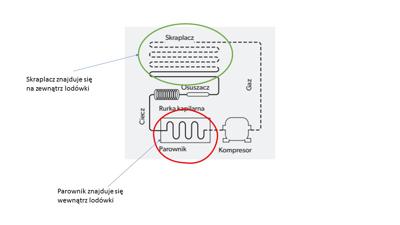 W układach kompresorowych przy pomocy zmian stanu skupienia czynnika chłodniczego oraz procesów zachodzących w układzie chłodniczym lodówki, ciepło zabierane jest z jej wnętrza za pomocą parownika i oddawane na zewnątrz przy pomocy skraplacza oraz wentylatora skraplacza. Dlatego przykładając rękę do kratki przy której zamontowany jest skraplacz lodówki wraz z wentylatorem czujemy ciepło, to świadczy że lodówka pracuje prawidłowo.