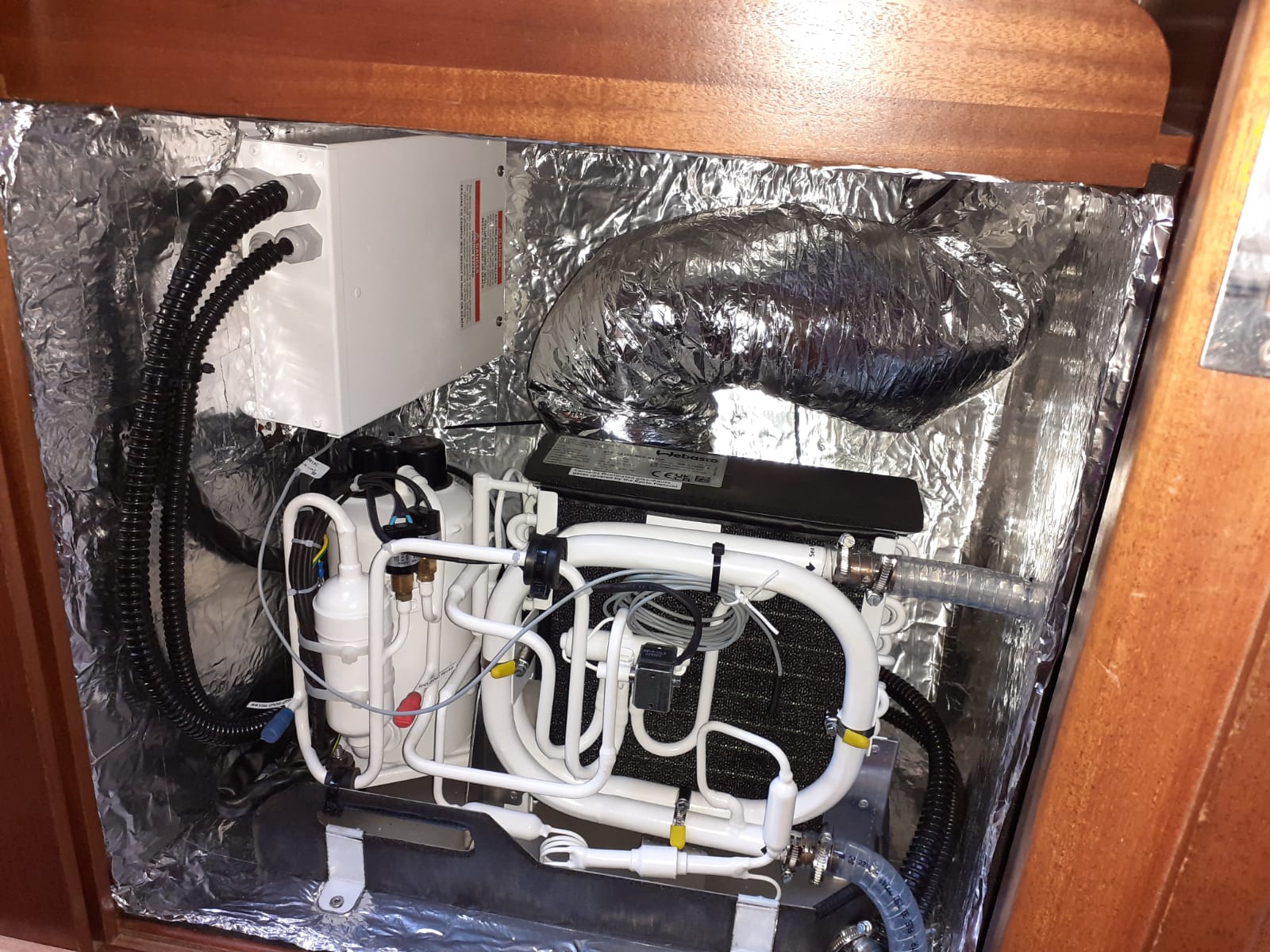 Warto również wspomnieć, że jako osoby układ zostały zamontowane dwa ogrzewania Webasto AirTopEvo 55 jako ogrzewania zapasowe i wspomagające, które dzięki zasysowi powietrza do ogrzania z zewnątrz doskonale pomogą usunąć wilgoć z wnętrza jachtu. Wyloty ogrzanego powietrza zamontowano w każdym z pomieszczeń zapewniając komfort nawet w najzimniejszych zakątkach świata.