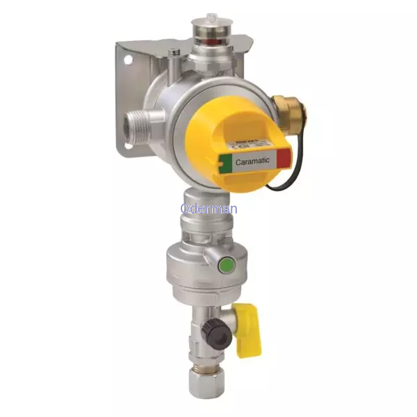 Zespół reduktora z zabezpieczeniem z automatycznym przełącznikiem do eksploatacji instalacji dwubutlowych w przyczepach i samochodach kempingowych podczas jazdy, do podłączenia do butli gazowych za pomocą węża wysokiego ciśnienia, do redukcji ciśnienia do ciśnienia nominalnego urządzenia gazowego
