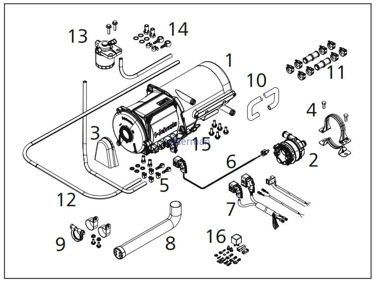 6 Wiązka przewodów pompy płynu chłodzącego 7 pojazd z wiązką przewodów, wentylator pojazdu, uchwyt bezpiecznika 8 Elastyczna rura wydechowa * 9 Materiał montażowy odciąg * 10 Wąż płynu chłodzącego 11 Materiał montażowy chłodziwo 12 Wąż paliwowy 13 Filtr paliwa 14 Materiał montażowy filtra paliwa 15 Montaż nagrzewnicy materiału 16 Materiał montażowy elektryczny